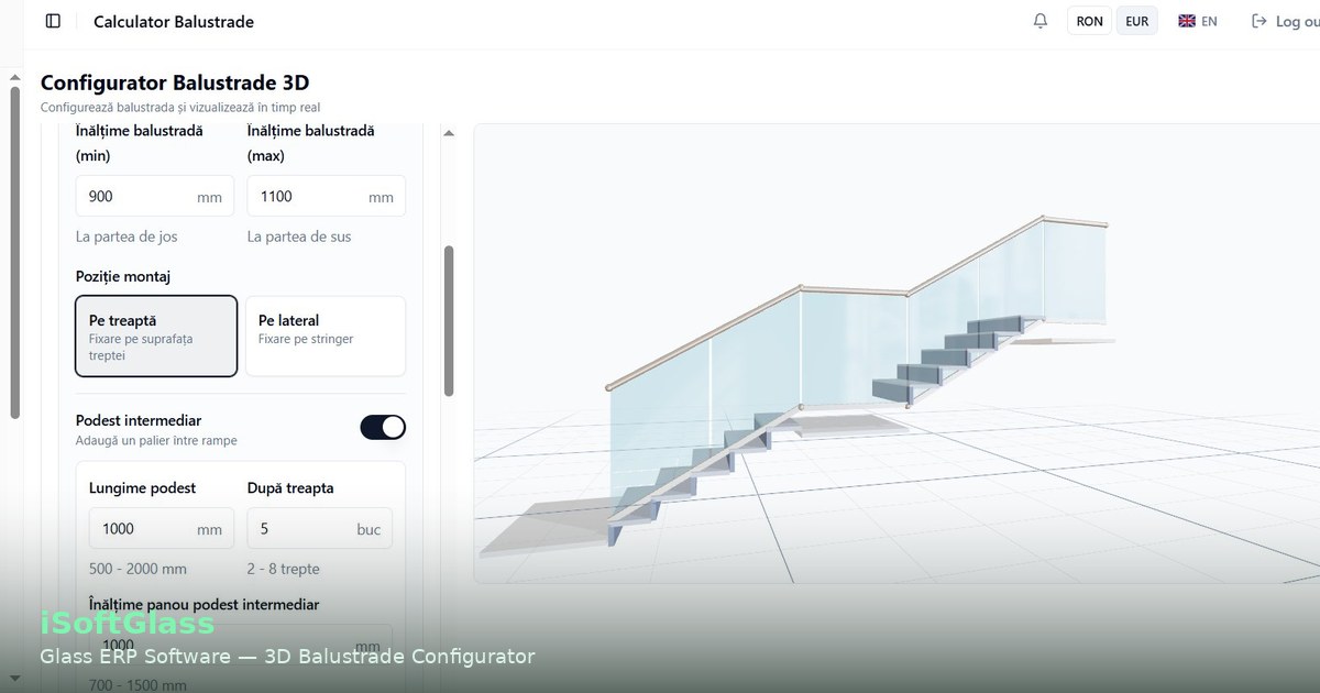 Real-time 3D balustrade configurator with parametric glass calculation software ensures clients see exactly what they’re ordering before production begins