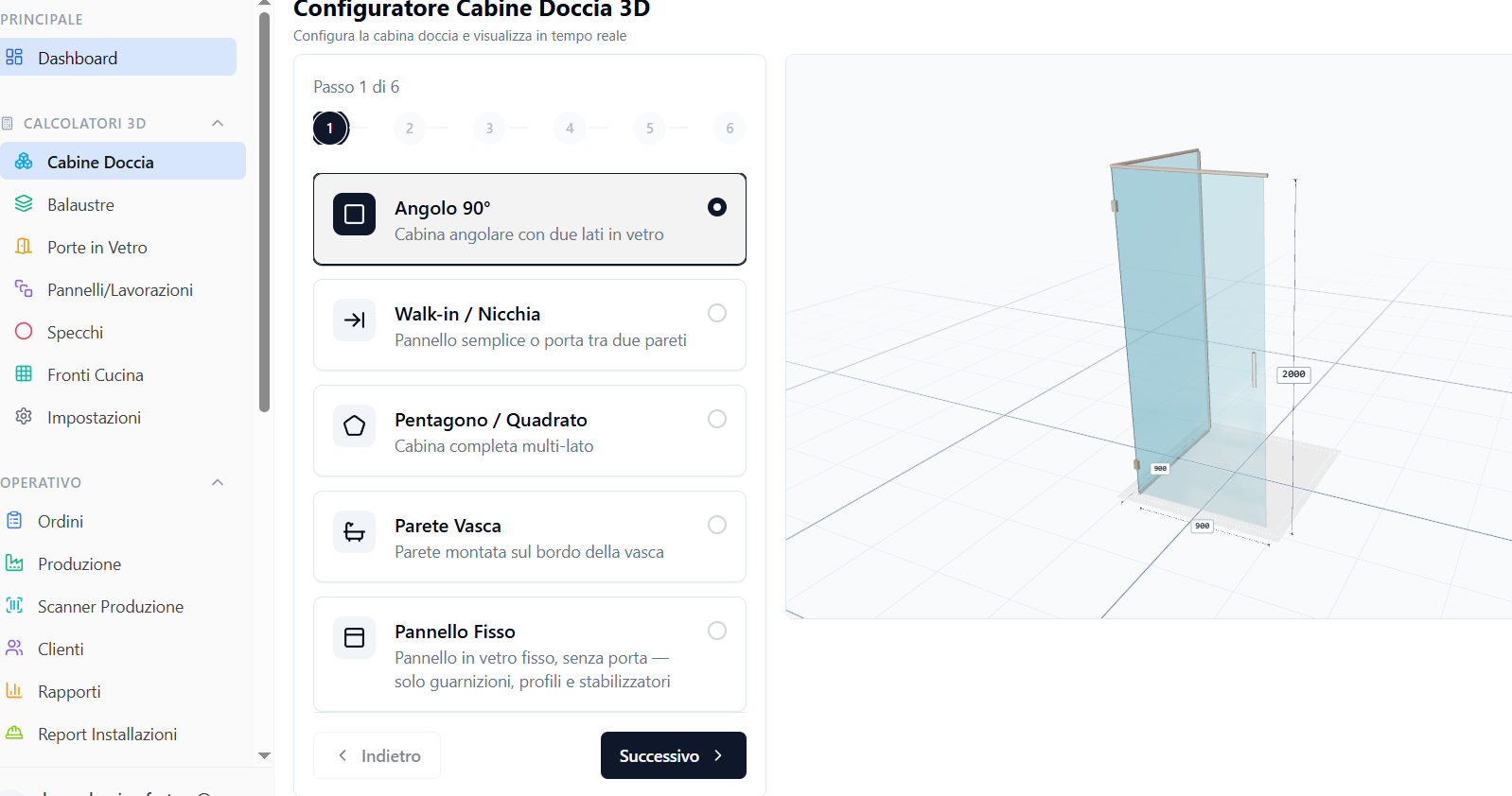 I clienti possono visualizzare immediatamente il risultato finale con dimensioni precise, materiali selezionati e finiture desiderate, riducendo incomprensioni e accelerando drasticamente il processo di vendita. Nella schermata vediamo le opzioni disponibili: Angolo 90° per cabine angolari con due lati in vetro, Walk-in/Nicchia per pannelli semplici o porte tra due pareti, Pentagono/Quadrato per cabine complete multi-lato, Parete Vasca per pareti montate sul bordo della vasca, e Pannello Fisso per vetro fisso senza porta.